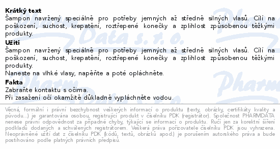 Šampon navržený speciálně pro potřeby jemných až středně silných vlasů. Cílí na poškození, suchost, krepatění, roztřepené konečky a zplihlost způsobenou těžkými produkty.