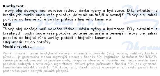 Tělový olej dopřeje vaší pokožce řádnou dávku výživy a hydratace. Díky extraktům z brazilských rostlin bude vaše pokožka viditelně pružnější a pevnější. Tělový olej zahalí pokožku do hřejivé vůně vanilky, pistácií a hřejivého karamelu.