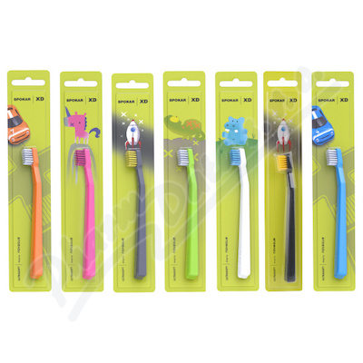 Kartáček je hustě osazen velmi jemnými a rovně střiženými vlákny s precizně zaoblenými konci. Zaručuje účinné odstranění zubního plaku a je šetrný k dětským dásním. Krátká délka vláken usnadňuje přístup k zadním zubům. Ergonomická rukojeť ve tvaru X.