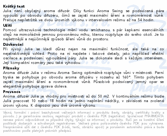 Julia není obyčejný aroma difuzér. Díky funkci Aroma Swing se podsvícená pára vypouští po obvodu difuzéru, čímž se zajistí maximální šíření a rovnoměrnost vůně. Pracuje nepřetržitě ve dvou úrovních výkonu v intervalovém režimu až na 54 hodin.