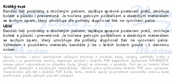 Bandáž řeší problémy s vbočeným palcem, zajišťuje správné postavení prstů, zmírňuje bolest a působí i preventivně. Je tvořena gelovým polštářkem a elastickým materiálem se suchým zipem, který umožňuje dle potřeby stupňovat tlak na vyrovnání palce.