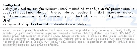 Vložky jsou tvořeny tenkým výliskem, který minimálně zmenšuje vnitřní prostor obuvi a podepírá podélnou klenbu. Příčnou klenbu podepírá měkké latexové srdíčko, vyměkčení v patní části vložky tlumí nárazy na patní kost. Povrch je překryt jehněčí usní.