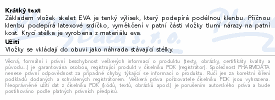 Základem vložek skelet EVA je tenký výlisek, který podepírá podélnou klenbu. Příčnou klenbu podepírá latexové srdíčko, vyměkčení v patní části vložky tlumí nárazy na patní kost. Krycí stélka je vyrobena z materiálu eva.
