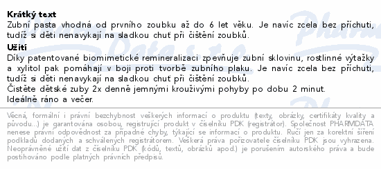 Zubní pasta vhodná od prvního zoubku až do 6 let věku. Je navíc zcela bez příchuti, tudíž si děti nenavykají na sladkou chuť při čištění zoubků.