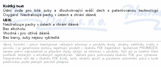 Ústní voda pro bílé zuby a dlouhotrvající svěží dech s patentovanou technologií Oxygard. Neutralizuje pachy v ústech a chrání dásně.