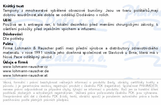 Tampony z mnohavrstvé vybělené obvazové buničiny. Jsou ve tvaru polštářků, mají dobrou soudržnost, ale dobře se oddělují.Dodáváno v rolích.