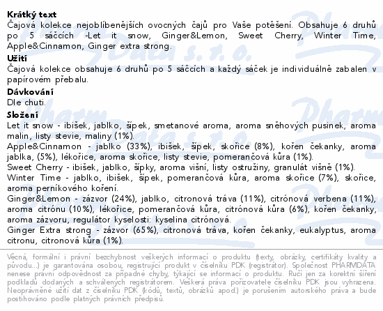 Čajová kolekce nejoblíbenějších ovocných čajů pro Vaše potěšení. Obsahuje 6 druhů po 5 sáčcích -Let it snow, Ginger&Lemon, Sweet Cherry, Winter Time, Apple&Cinnamon, Ginger extra strong.