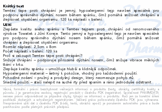 Temtex tape proti chrápání je jemný, hypoalergenní tejp navržen speciálně pro podporu správného dýchání nosem během spánku, čímž pomáhá snižovat chrápání a zlepšovat okysličení organismu. 120 ks náplastí v balení.