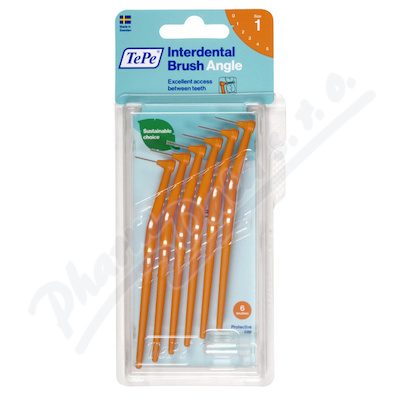 TePe Angle, mezizubní kartáček s prodlouženou rukojetí, 6 ks v blistru. Jednoduché zavádění do mezizubních prostor. Štíhlá čistící hlava je zahnutá do pravého úhlu. Dlouhá, plochá rukojeť pro jistou manipulaci. Plastem izolovaný drátek je šetrný k zubům.