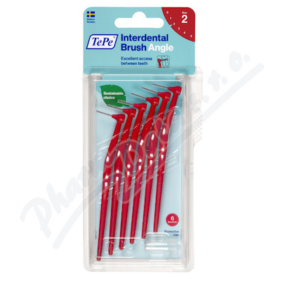 TePe Angle, mezizubní kartáček s prodlouženou rukojetí, 6 ks v blistru. Jednoduché zavádění do mezizubních prostor. Štíhlá čistící hlava je zahnutá do pravého úhlu. Dlouhá, plochá rukojeť pro jistou manipulaci. Plastem izolovaný drátek je šetrný k zubům.