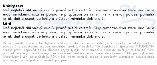 Náš nejlehčí silikonový dudlík jemně svítící ve tmě. Díky symetrickému tvaru dudlíku a ergonomickému štítu se pohodlně přizpůsobí tváři miminka v jakékoli poloze, pomáhá jej uklidnit a uspat. Je lehký a v ústech miminka dobře drží.