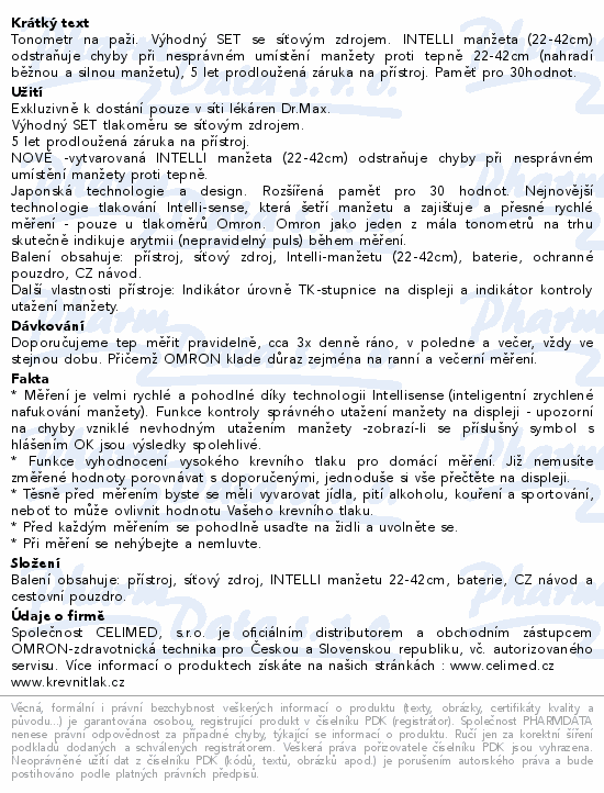 Tonometr na paži. Výhodný SET se síťovým zdrojem. INTELLI manžeta (22-42cm) odstraňuje chyby při nesprávném umístění manžety proti tepně 22-42cm (nahradí běžnou a silnou manžetu), 5 let prodloužená záruka na přístroj. Paměť pro 30hodnot.