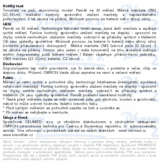 Tonometr na paži, ekonomický model. Paměť na 30 měření. Měkká manžeta CM2 (22-32cm), indikátor kontroly správného utažení manžety a nepravidelného pulsu