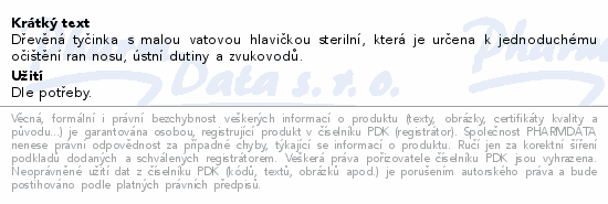 Dřevěná tyčinka s malou vatovou hlavičkou sterilní, která je určena k jednoduchému očištění ran nosu, ústní dutiny a zvukovodů.