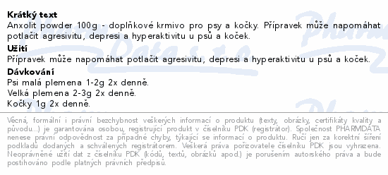 Anxolit powder 100g - doplňkové krmivo pro psy a kočky. Přípravek může napomáhat potlačit agresivitu, depresi a hyperaktivitu u psů a koček.