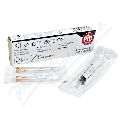 Vakcinační kit, který obsahuje jednu plastovou stříkačku plus dvě jehly, které jsou určeny k aplikaci vakcíny.