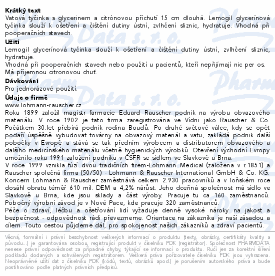 Vatová tyčinka s glycerinem a citrónovou příchutí 15 cm dlouhá. Lemogil glycerínová tyčinka slouží k ošetření a čištění dutiny ústní, zvlhčení sliznic, hydratuje. Vhodná při pooperačních stavech.