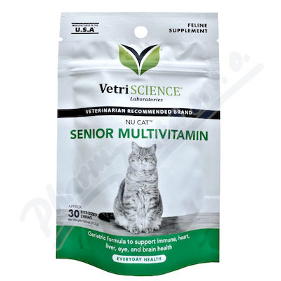 Nu-Cat Senior Multivitamin je speciálně vyvinut pro geriatrické kočky. Jde o komplexní recepturu, která podporuje kardiovaskulární systém, játra, mozkovou činnost, oči, klouby a zažívací funkce. Chutné kousky ve tvaru ryby s příchutí kuřecích jater.