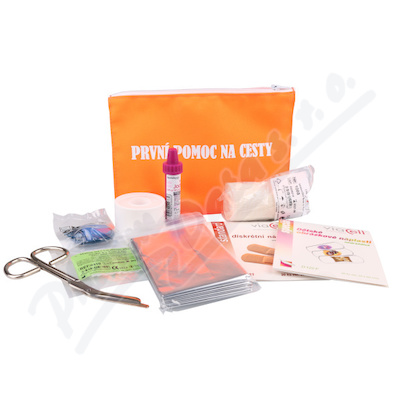 Souprava pro poskytnutí dočasné předlékařské pomoci. Souprava obsahuje např. cívkovou náplast, desinfekci, obvaz, náplasti s polštářkem, izotermickou folii.