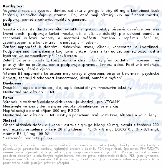 Veganské kapsle s vysokou dávkou extraktu z ginkgo biloby 60 mg a kombinací látek ženšenu, zeleného čaje a vitaminu B6, které mají příznivý vliv na činnost mozku, podporují paměť a celkovou vitalitu organismu.
