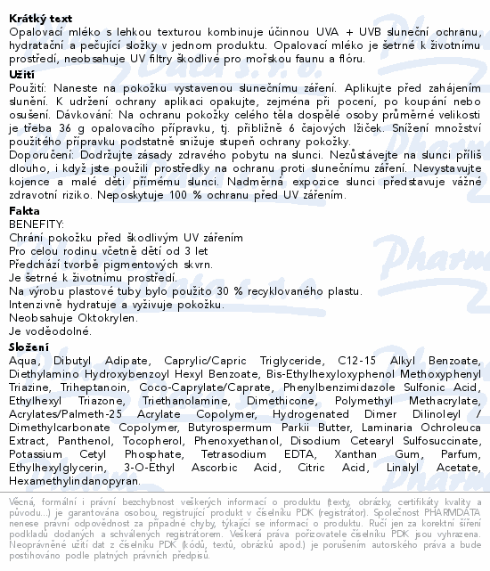 Opalovací mléko s lehkou texturou kombinuje účinnou UVA + UVB sluneční ochranu, hydratační a pečující složky v jednom produktu. Opalovací mléko je šetrné k životnímu prostředí, neobsahuje UV filtry škodlivé pro mořskou faunu a flóru.