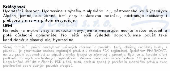 Hydratační šampon Hydrashine s výtažky z alpského lnu, pěstovaného ve švýcarských Alpách, jemně, ale účinně čistí vlasy a vlasovou pokožku, odstraňuje nečistoty i přebytečný maz – a přitom nevysušuje.