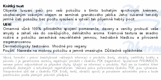 Objevte luxusní péči pro vaši pokožku s tímto bohatým sprchovým krémem, obohaceným vzácným olejem ze semínek granátového jablka. Jeho cukerné tenzidy jemně čistí pokožku bez pocitu vysušení a vytváří tak příjemně hebký pocit.