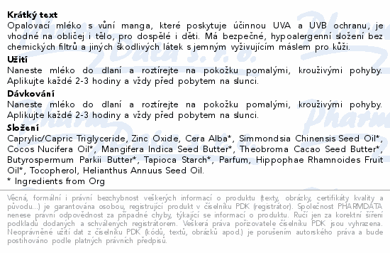 Opalovací mléko s vůní manga, které poskytuje účinnou UVA a UVB ochranu, je vhodné na obličej i tělo, pro dospělé i děti. Má bezpečné, hypoalergenní složení bez chemických filtrů a jiných škodlivých látek s jemným vyživujícím máslem pro kůži.