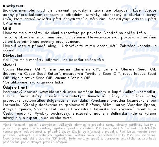 Bio-intenzivní olej urychluje tmavnutí pokožky a zabraňuje olupování kůže. Vysoce účinný přípr.s kakaem, kokosem a přírodními semínky, obohacený o okurku a černý kmín, které chrání pokožku před dehydratací a stárnutím. Neposkytuje ochranu před UV zářením.