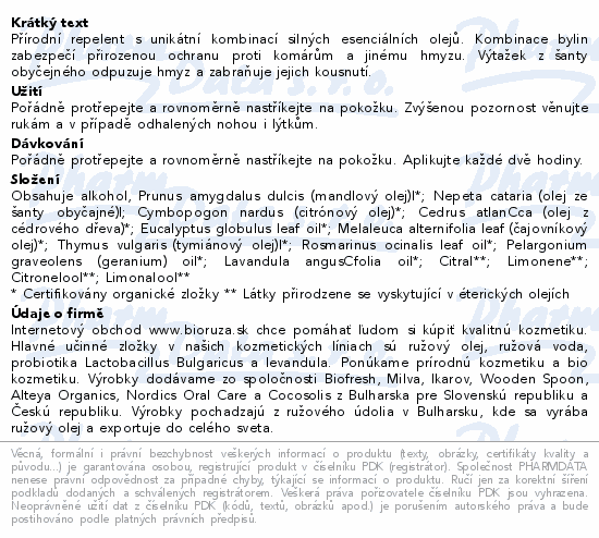 Přírodní repelent s unikátní kombinací silných esenciálních olejů. Kombinace bylin zabezpečí přirozenou ochranu proti komárům a jinému hmyzu. Výtažek z šanty obyčejného odpuzuje hmyz a zabraňuje jejich kousnutí.