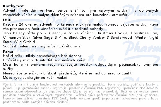 Adventní kalendář ve tvaru věnce s 24 vonnými čajovými svíčkami v oblíbených vánočních vůních a malým skleněným svícnem pro kouzelnou atmosféru.