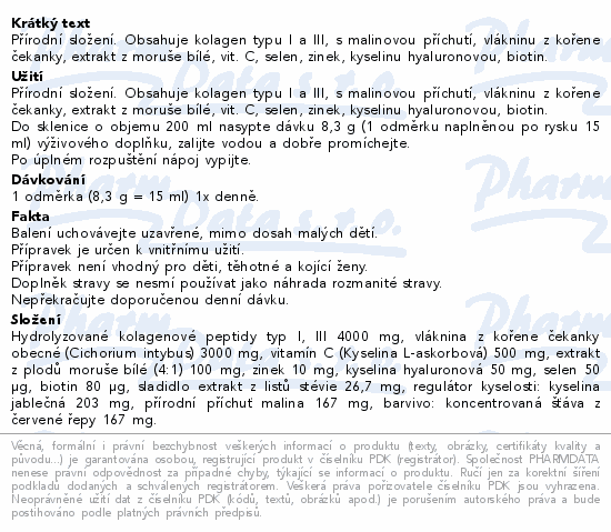Přírodní složení. Obsahuje kolagen typu I a III, s malinovou příchutí, vlákninu z kořene čekanky, extrakt z moruše bílé, vit. C, selen, zinek, kyselinu hyaluronovou, biotin.
