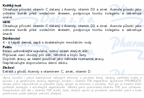 Obsahuje přírodní vitamín C získaný z Aceroly, vitamín D3 a zinek. Acerola působí jako ochrana buněk před oxidačním stresem, podporuje tvorbu kolagenu a zabraňuje únavě.