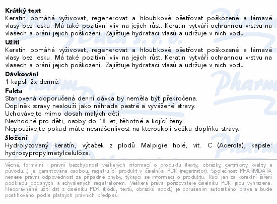 Keratin pomáhá vyživovat, regenerovat a hloubkově ošetřovat poškozené a lámavé vlasy bez lesku. Má také pozitivní vliv na jejich růst. Keratin vytváří ochrannou vrstvu na vlasech a brání jejich poškození. Zajišťuje hydrataci vlasů a udržuje v nich vodu.