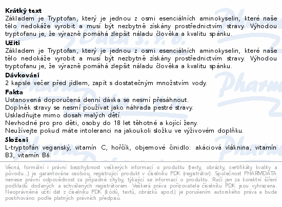 Základem je Tryptofan, který je jednou z osmi esenciálních aminokyselin, které naše tělo nedokáže vyrobit a musí být nezbytně získány prostřednictvím stravy. Výhodou tryptofanu je, že výrazně pomáhá zlepšit náladu člověka a kvalitu spánku.