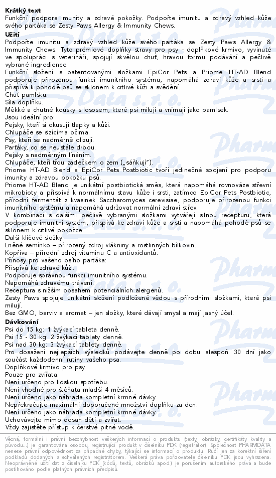 Funkční podpora imunity a zdravé pokožky. Podpořte imunitu a zdravý vzhled kůže svého parťáka se Zesty Paws Allergy & Immunity Chews.